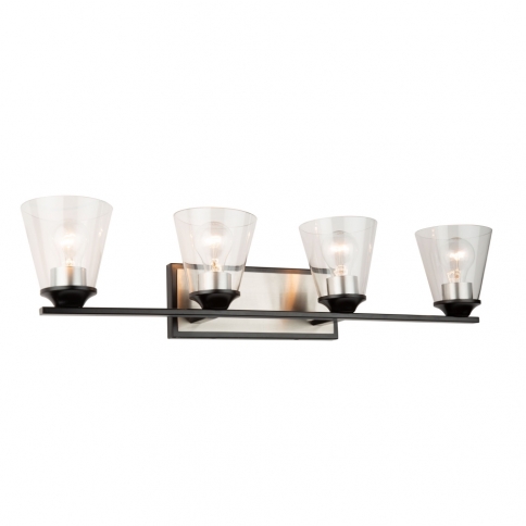DESCRIPTION : Designed by Lighting Pulse, this "Wheaton" collection bathroom vanity features black frames with brushed nickel accents complimented by clear cone shaped glassware.