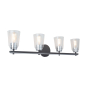 The Essex collection features elegant clear glassware, adding a touch of sophistication to any bathroom decor. Its standout design is characterized by a striking dual-tone finish, combining sleek black and chrome elements seamlessly. This collection effortlessly blends modern aesthetics with functional utility, creating a stylish focal point for your bathroom space. 4 light wall sconce shown. (Also available in a single and 3 light versions.)
