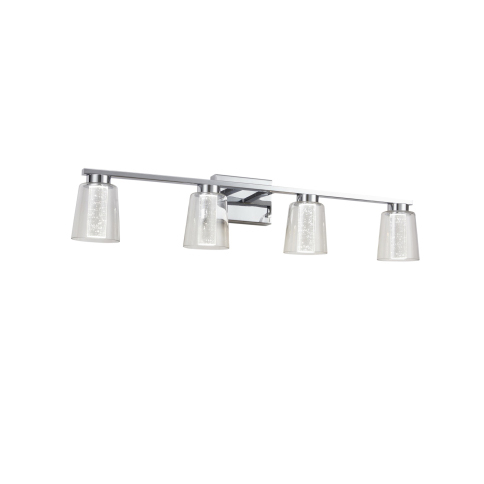 The Dalton Collection features a distinctive design with a clear outer glass surrounding a interior seeded cylinder glass, creating a unique and modern aesthetic. The LED lighting is skillfully integrated to accentuate the seeded glass, providing a visually striking and exceptional effect. Show in with a chrome frame (also available in black). Additionally, these models have a built-in LED switch, allowing users to effortlessly adjust the color temperature from 3000, 4000, and 5000 kelvin for a customizable lighting experience. This collection seamlessly combines functionality with an eye-catching design, making it an elegant choice for any bathroom space. 4 light wall sconce shown. (Also available in a single and 3 light versions.)