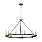 Created by designer Kevin Kraemer, the Notting Hill collection showcases a sophisticated design with black metal frames, exquisitely complemented by brass candle covers and accents. The combination of these finishes adds a touch of elegance and modernity to the collection, creating a visually striking and stylish visual. The use of specific elements highlights Kraemer's attention to detail and commitment to creating unique, contemporary pieces. The 9 light ring type chandelier is shown. (Height adjustable via chain)